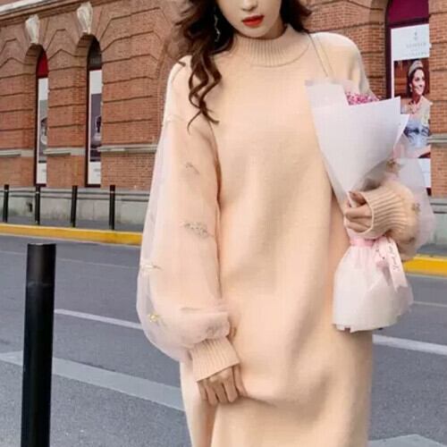 ランタンスリーブ 長袖 ニット ワンピース ラウンドネック 大人 可愛い カジュアル キレイめ 上品 エレガント お出かけ お買い物 デート 女子会 春 秋 通学 学生 通勤 韓国ファッション