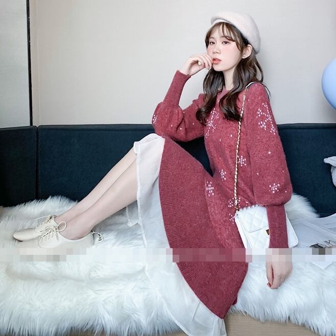 ひざ丈 裾レース ニット ワンピース ドレス 柄 大人 可愛い カジュアル キレイめ 上品 エレガント お出かけ お買い物 デート 女子会 秋 冬 春 通学 学生 通勤 韓国ファッション