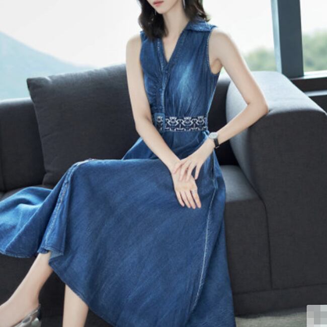 ワンピース ロング丈 デニムワンピース Vネック ノースリーブ ウエストベルト フロントボタン フレア 上品 ジーンズ カジュアル 大人 夏