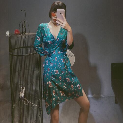 ダークグリーンで甘くなりすぎない花柄が大人可愛い一枚です。