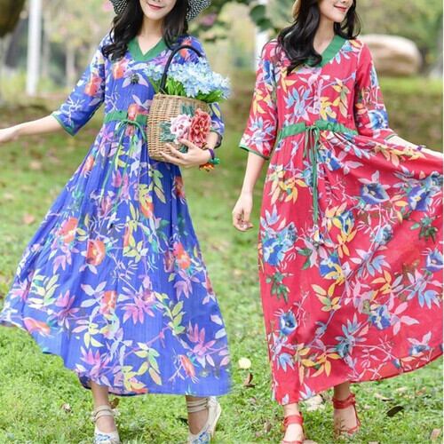 全2色 大きいサイズ ロングワンピース 花柄 Vネック 七分袖 フレアスカート レトロ きれいめ カジュアル リゾート フェミニン 夏 ブルー レッド
