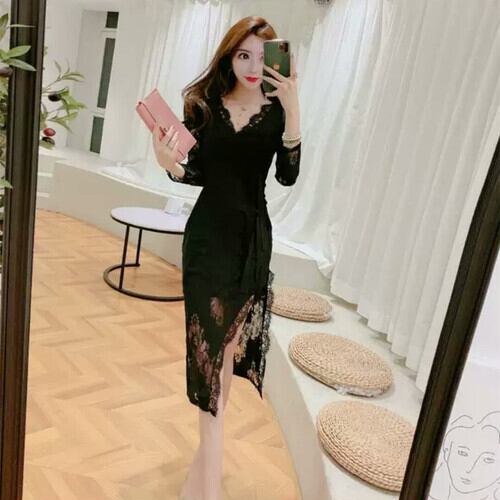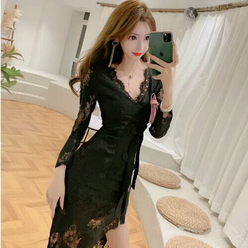全2色 Vネック スリム レース ワンピース ドレス ショート丈 タイト アシンメトリー 大人 エレガント 上品 可愛い キレイめ お呼ばれ パーティー お出かけ お買い物 デート 女子会 通学 学生 通勤 韓国ファッション