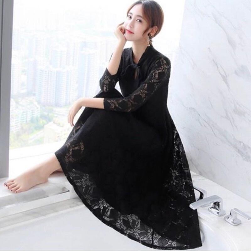 全3色 レース ワンピース ドレス ロング丈 ボウタイネック リボン ハイウエスト フレア Aライン 7分袖 上品 エレガント パーティー お呼ばれ オケージョン シースルー 春 夏