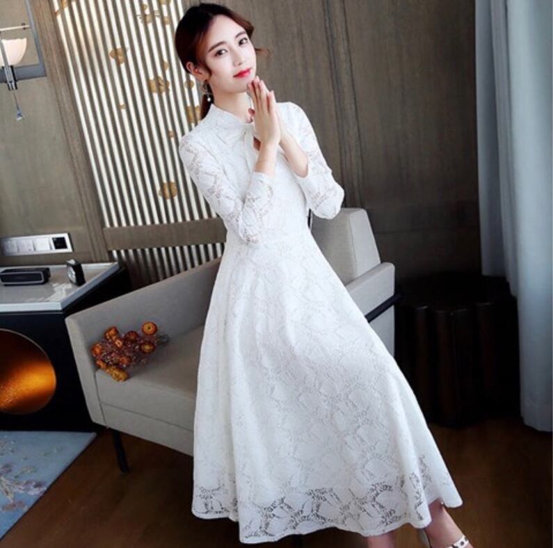 レースのディテールが美しいロング丈ワンピースドレスです。
