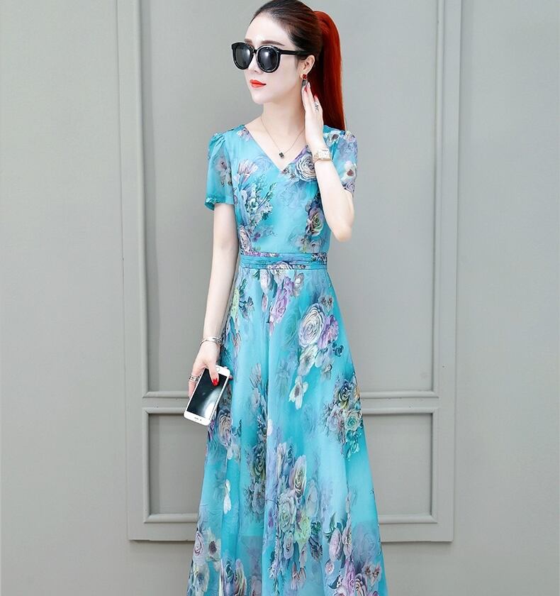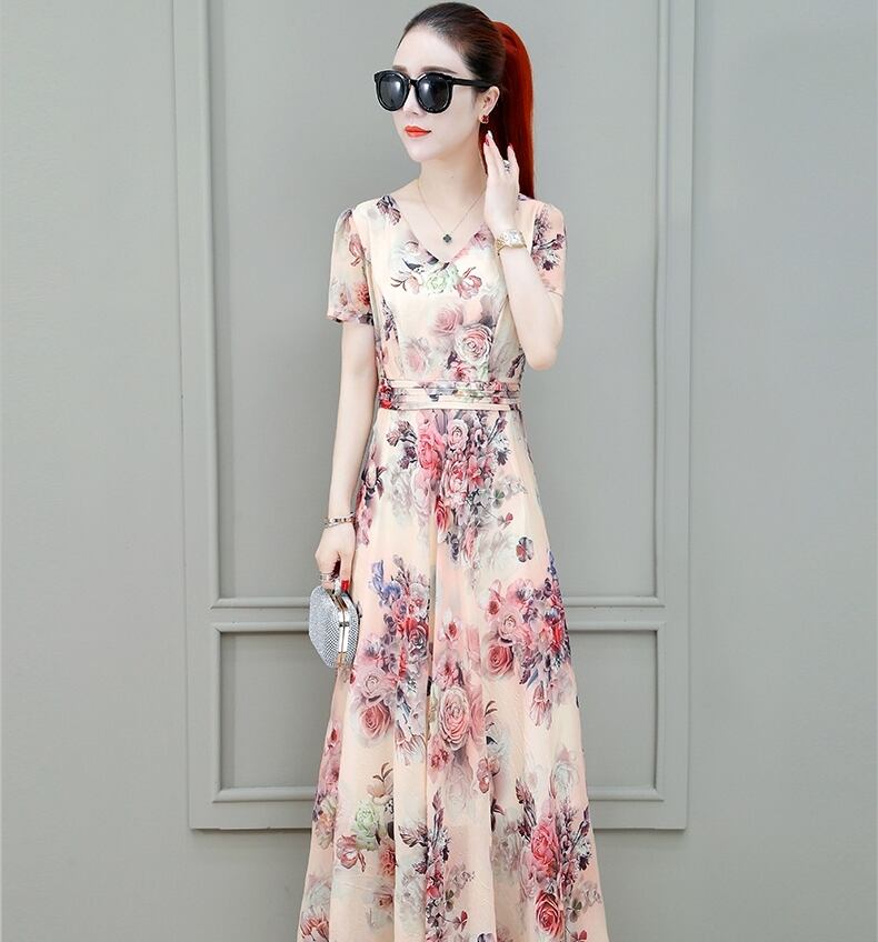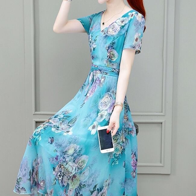 全2色 ワンピース ロング丈 花柄 半袖 Vネック ハイウエスト スリム カジュアル きれいめ リゾート フェミニン シフォン 大人可愛い 春 夏