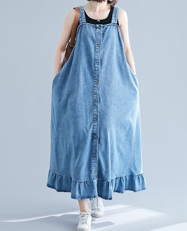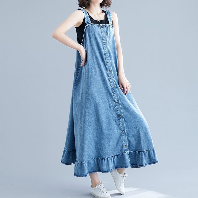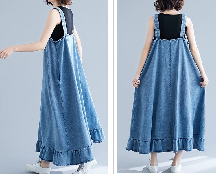 ワンピース デニムワンピース ジャンパースカート ロング丈 ビッグシルエット ゆったりオーバーサイズ 体型カバー ジーンズ フリル スクエアネック フロントボタン カジュアル 春 夏
