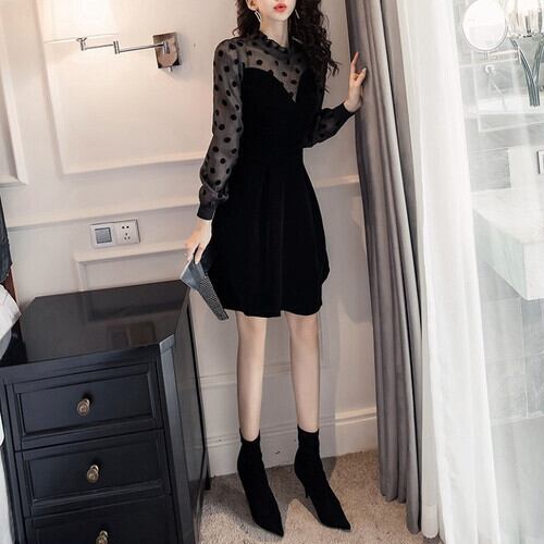 ミニワンピース パーティドレス 長袖 レース ドット フレア ベロア ひざ丈 きれいめ レトロ フォーマル 結婚式 二次会 ブラック