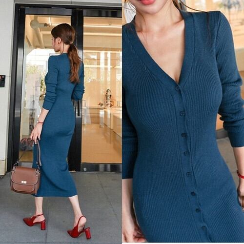 スリムなニットのセーターがボタンがついてセクシーに見え、