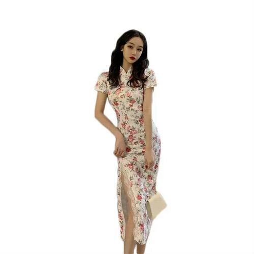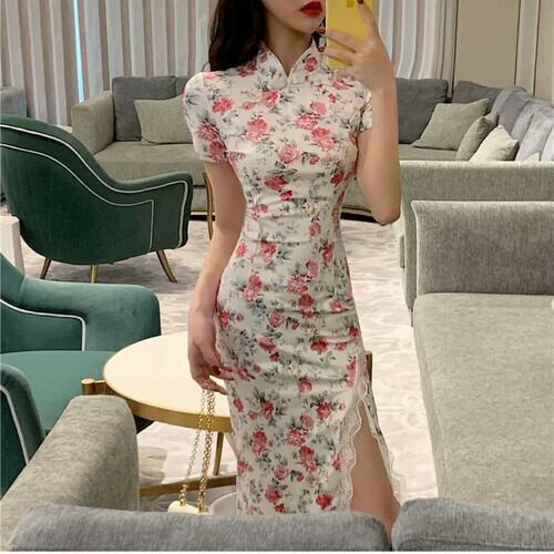 花柄 レトロ チャイナドレス風 ワンピース スリット ロング丈 大人 エレガント 上品 可愛い キレイめ お出かけ お買い物 デート 女子会 通学 学生 通勤 韓国ファッション 春 夏