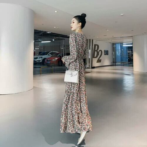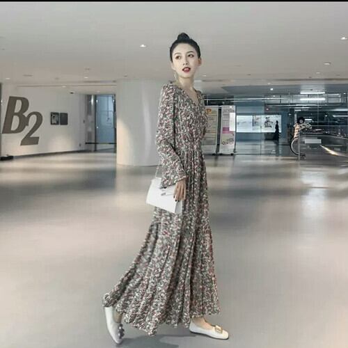 Vネック ウエストスリム 花柄 ワンピース マキシ丈 大人 カジュアル キレイめ 可愛い お出かけ お買い物 デート 女子会 通学 学生 通勤 韓国ファッション 春 夏 秋