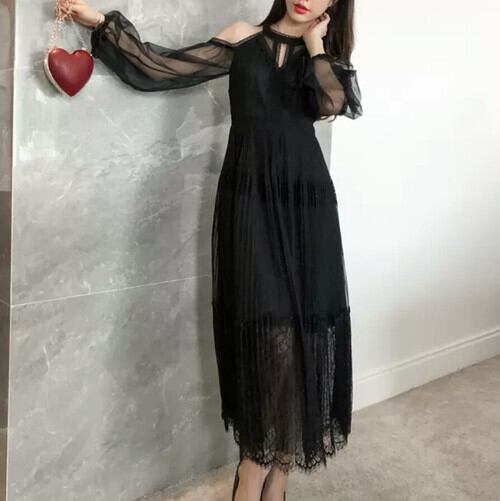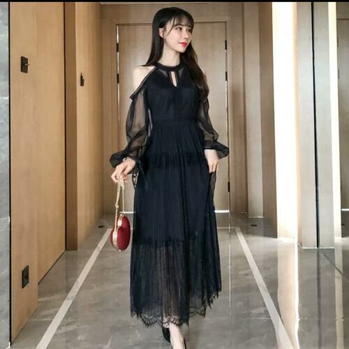オープンショルダー シフォン ワンピース ドレス ロング丈 大人 キレイめ 可愛い スタイリッシュ お呼ばれ パーティー お出かけ お買い物 デート 女子会 通学 学生 通勤 韓国ファッション 春 夏 秋