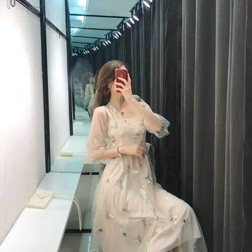 花柄 シフォン 刺繍 ワンピース 大人 キレイめ フェミニン エレガント 可愛い 上品 お出かけ お買い物 デート 女子会 通学 学生 通勤 韓国ファッション 春 夏