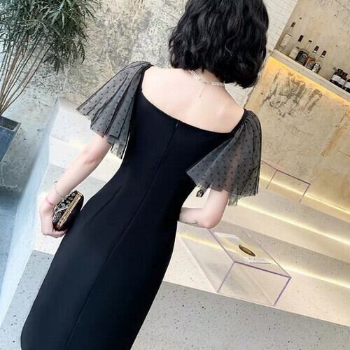 パーティドレス ワンピース イブニングドレス フレアスリーブ スリム タイト ひざ丈 ミディ丈 スリット 半袖 無地 エレガント セクシー パーティ フォーマル 結婚式 二次会 ブラック