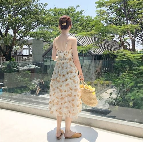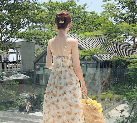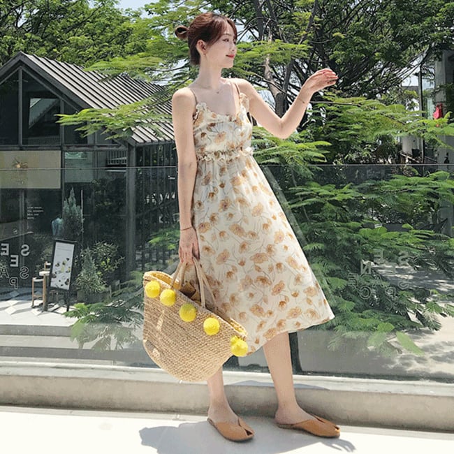 全2色 キャミソールワンピース サマードレス キャミワンピ フレアスカート 花柄 ひざ丈 ミディ丈 フリル ガーリー リゾート カジュアル 夏 グリーン イエロー