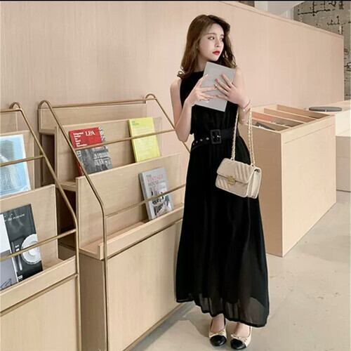全2色 ノースリーブ ベルト シフォン ワンピース ドレス 無地 シンプル 大人 カジュアル 可愛い キレイめ エレガント 上品 お出かけ お買い物 デート 女子会 通学 学生 通勤 韓国ファッション 春 夏