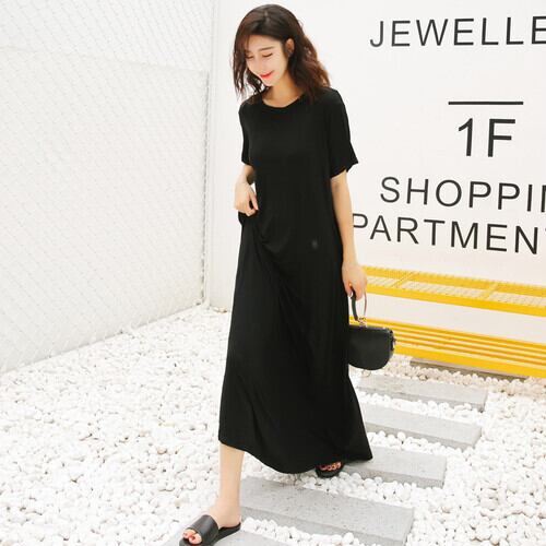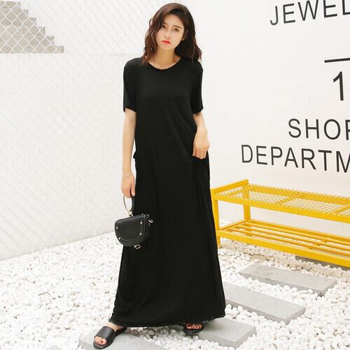 ワンピース Tシャツワンピース マキシ丈 ゆったり ラウンドネック 半袖 体型カバー オーバーサイズ ビッグシルエット 無地 ダークカラー シンプル お出かけ 大人 カジュアル デイリー 春 夏