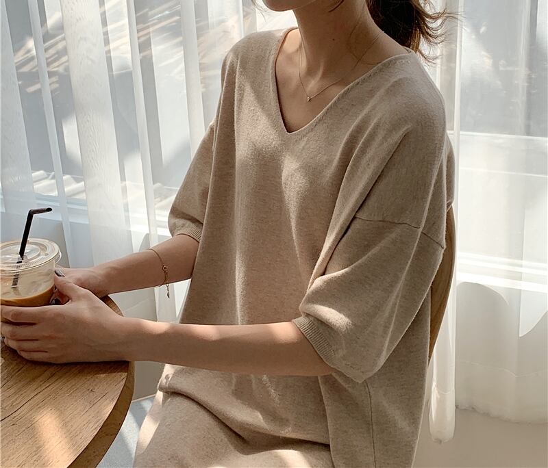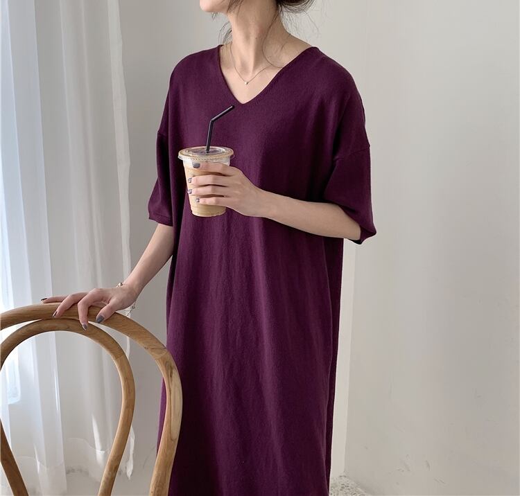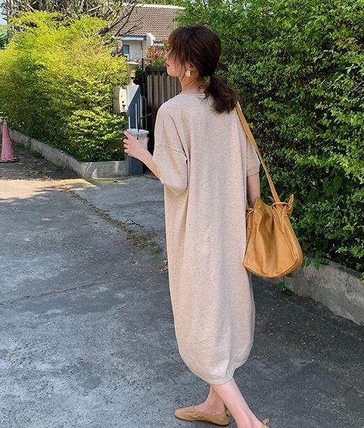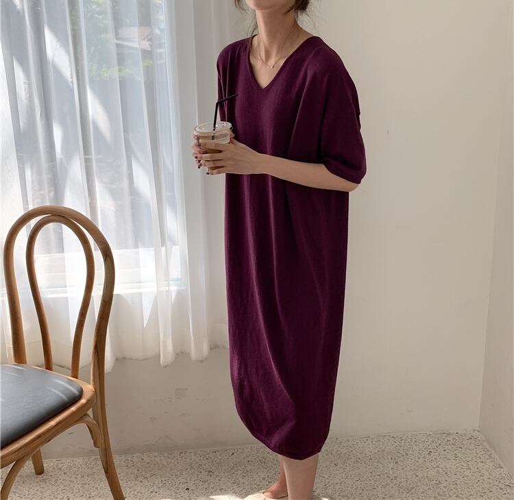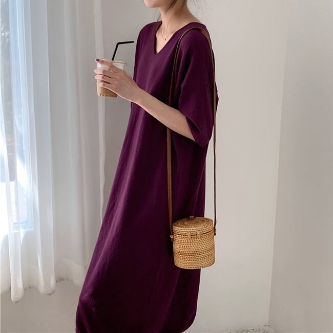 全3色 ワンピース サマーニット オーバーサイズ ゆったり ビッグシルエット 体型カバー 5分袖 ミモレ丈 大人 カジュアル デイリー シンプル 無地 お出かけ リゾート 春 夏