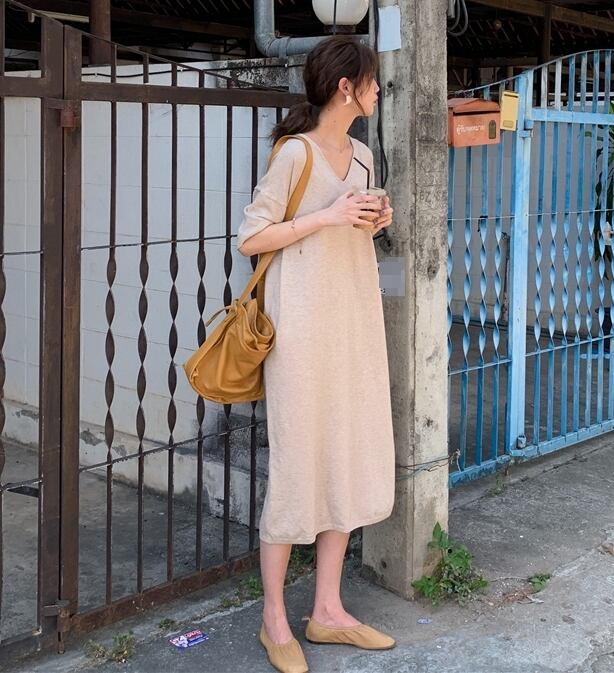 トレンドのゆったりシルエットで大人の抜け感を演出するミモレ丈ワンピース。