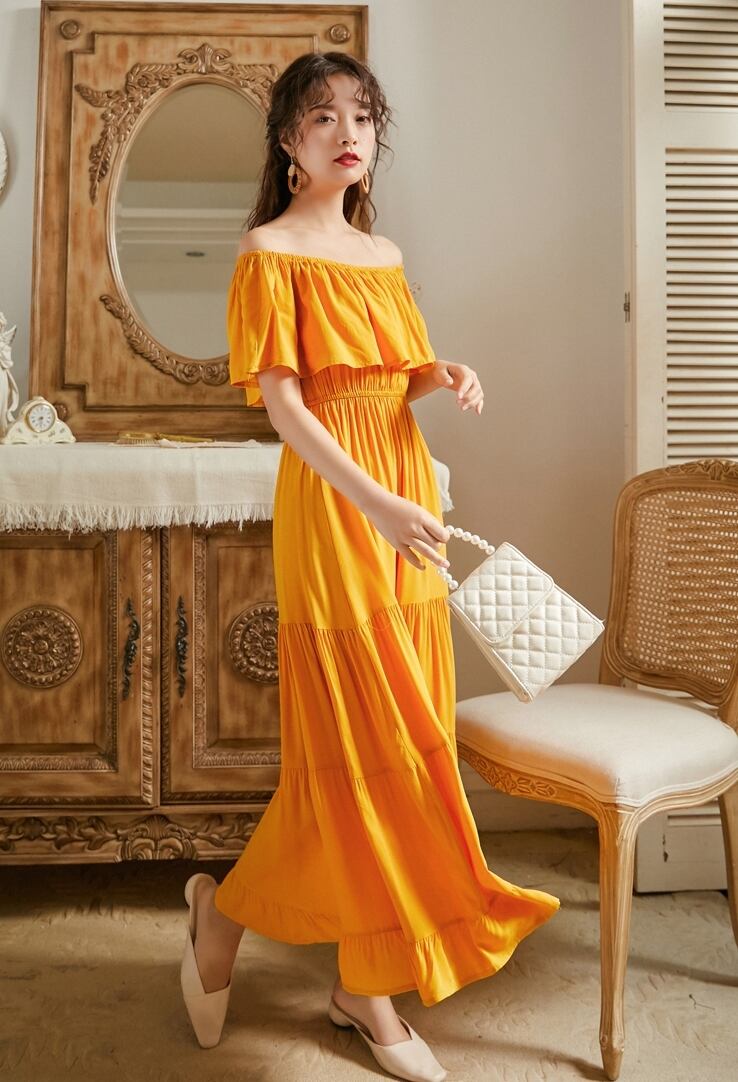 全3色 ワンピース オフショルダー フリル ロング丈 ティアード ウエストシャーリング 無地 スリム 上品 大人可愛い リゾート カジュアル 春 夏