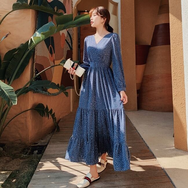 花びら柄 ワンピース ロング丈 ティアード フレア カシュクールネック Vネック 長袖 上品 カジュアル きれいめ デート リゾート 大人可愛い ハイウエスト 春 夏