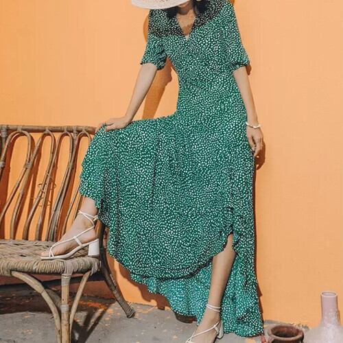 花柄 フローラル Vネック アシンメトリー 半袖 ワンピース ロング丈 大人 カジュアル 可愛い キレイめ お出かけ お買い物 デート 女子会 通勤 通学 学生 韓国ファッション 春 夏