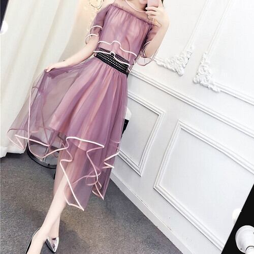 全4色 パーティードレス ツーピース ワンピース チュール メッシュ ロング アシンメトリー 肩出し きれいめ 無地 パーティ 結婚式 二次会 ダークグリーン ブラック グレー ピンク 秋冬