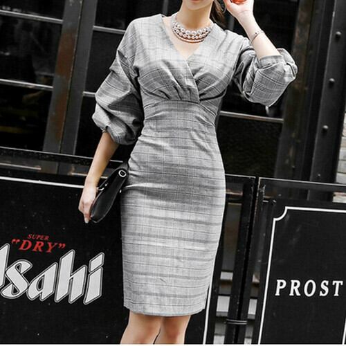 ワンピース ミニ丈 ひざ丈 長袖 パフスリーブ ボディコン タイト Vネック チェック 韓国 きれいめ オフィス 通勤 お呼ばれ デート パーティ グレー 秋冬