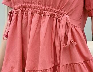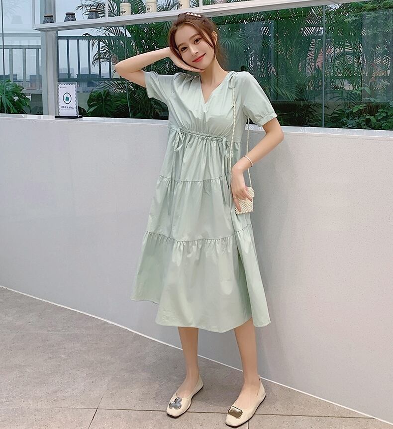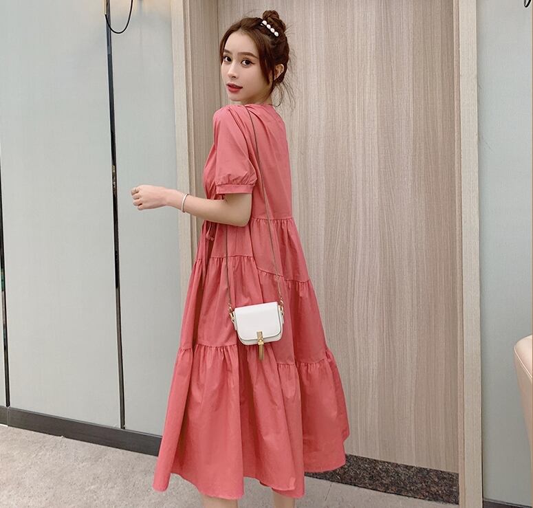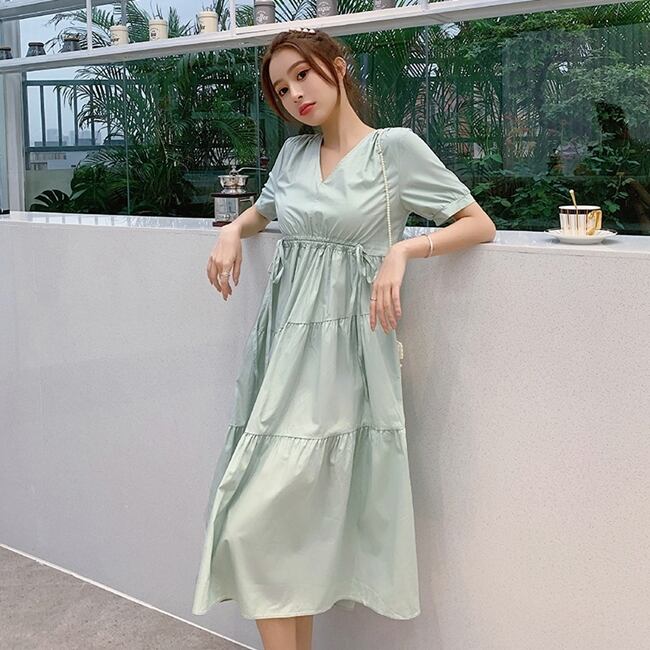 全2色 ワンピース ミモレ丈 ティアード フレア ゆったり 半袖 無地 Vネック 可愛い フロントシャーリング カジュアル きれいめ デート リゾート 韓国ファッション 春 夏