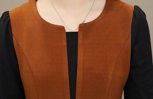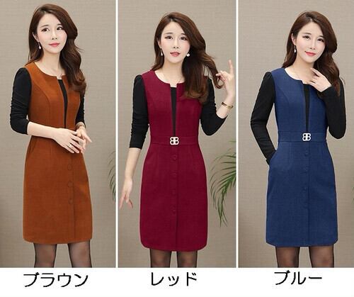 全3色 フェイクツーピース ジャンパースカート ワンピース ドレス フロントボタン フォーマル ひざ丈 オフィス スリット ウエストマーク 秋 冬 重ね着 Vネック 韓国 オルチャン