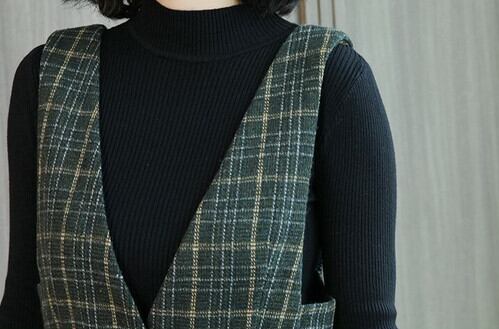 全2色 ツーピース ウール ワンピース チェック 膝丈 ミディ丈 Vネック 大人カジュアル ジャンパースカート 秋 オフィス 通勤着 重ね着 韓国 オルチャン