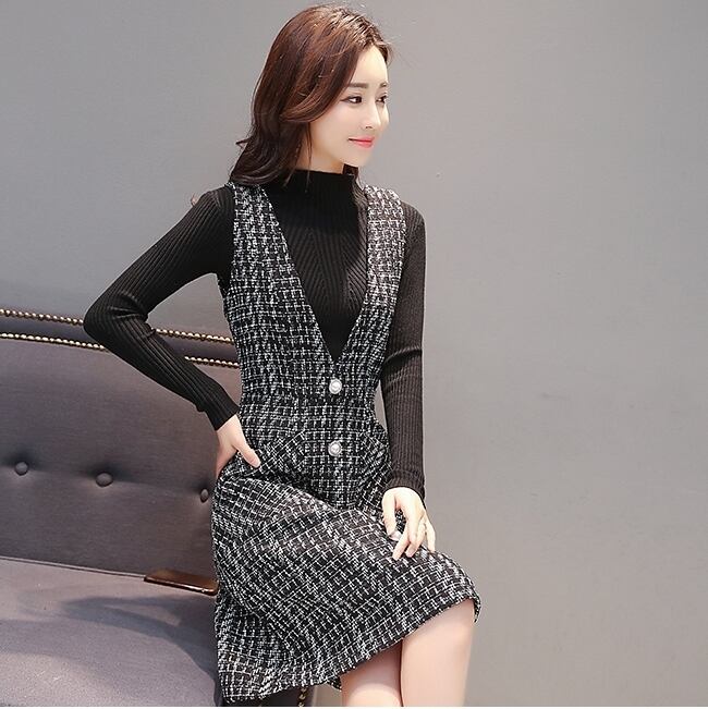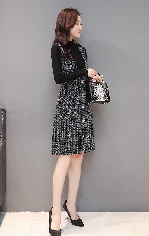ワンピース チュニックスカート ひざ丈 チェック柄 バイカラー ボタン Vネック ノースリーブ ポケット 秋 冬