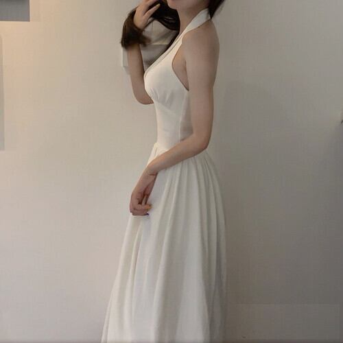 ホルターネックワンピース リゾートワンピース ドレス ロング丈 無地 着痩せ きれいめ フェミニン レトロ バックコンシャス マリリン モンロー デート リゾート 夏 ホワイト