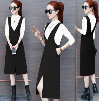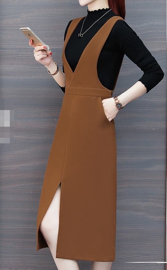 全2色 ワンピース サロペットスカート スリット ひざ丈 スリム Vネック 上品 カジュアル 大人 ポケット