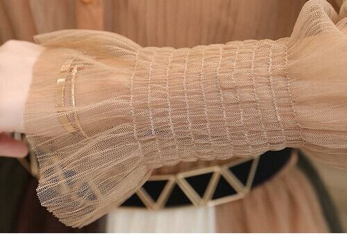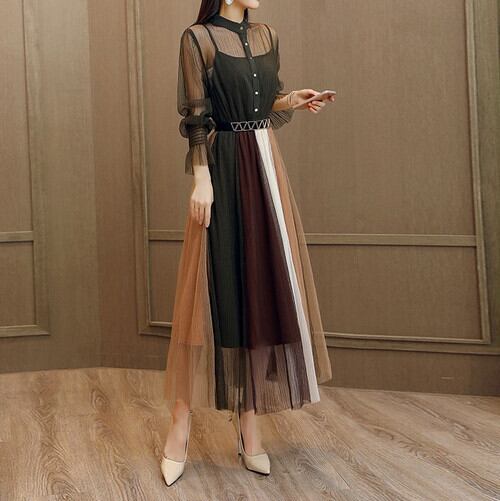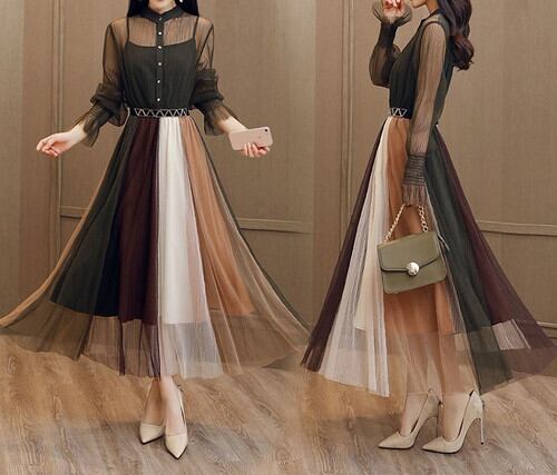 全3色 ワンピース ドレス チュールワンピース ロング丈 マキシ丈 長袖 透け感 シースルー ウエストゴム 切り替え フレア ダブルスカート 秋冬 パーティ 結婚式 二次会 アーミーグリーン キャラメル アイボリー