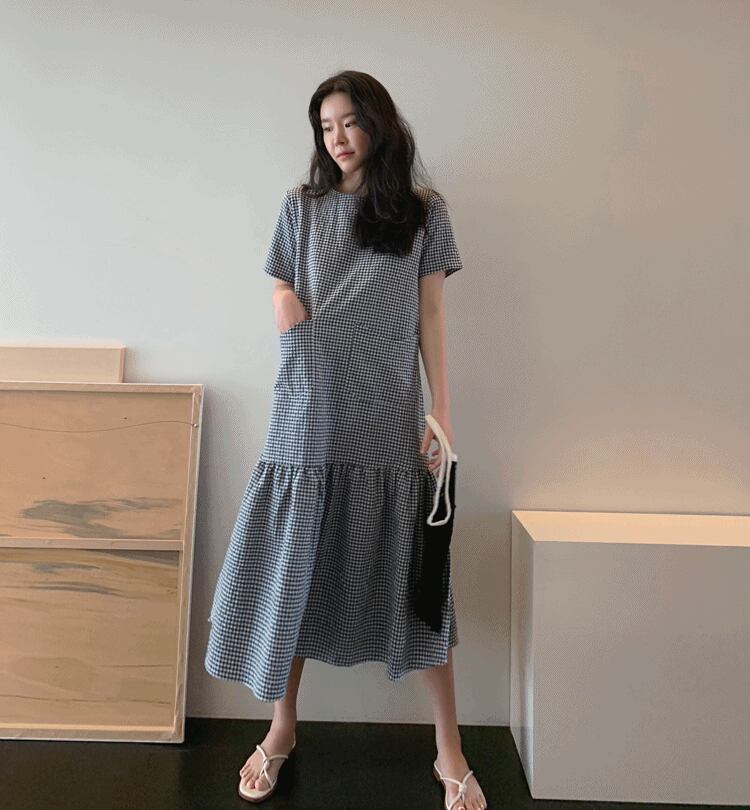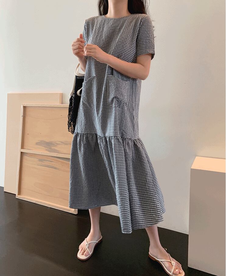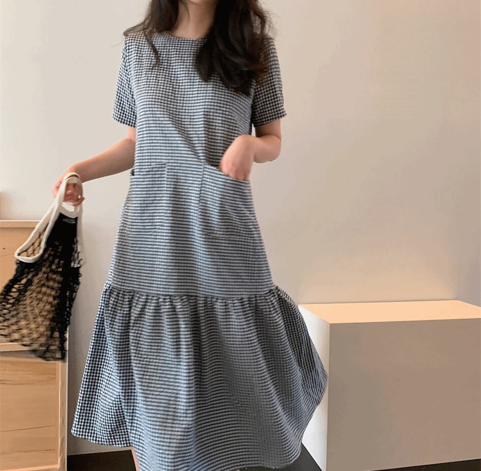 ワンピース チェック柄 マーメイド フリル フレア ゆったり オーバーサイズ 体型カバー ミモレ丈 ラウンドネック 半袖 大人 カジュアル デイリー 韓国ファッション 春 夏