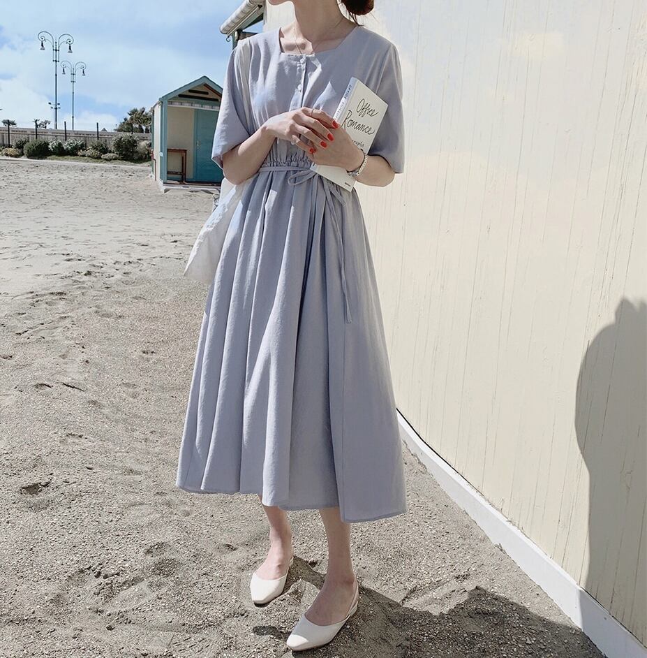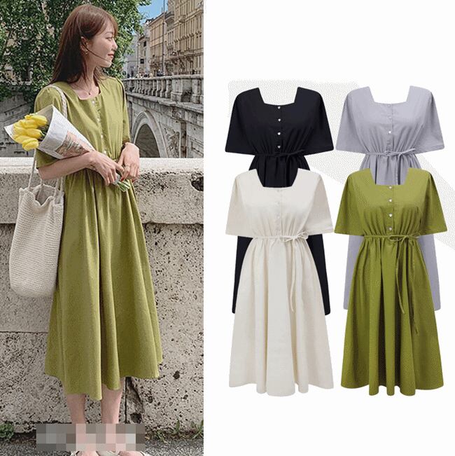 全4色 ワンピース 麻 リネン ミモレ丈 ネックボタン スクエアネック 5分袖 ウエストリボン フレア 無地 大人 シンプル カジュアル お出かけ リゾート レトロ 春 夏