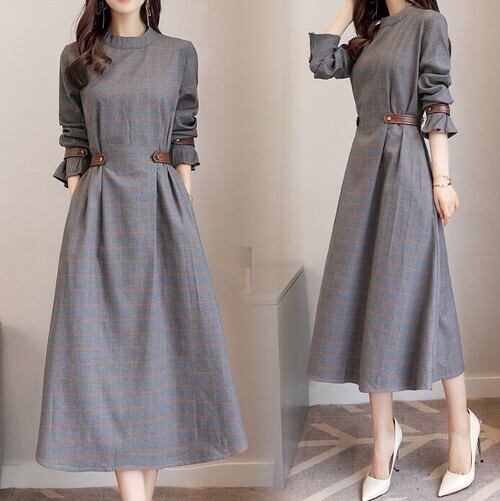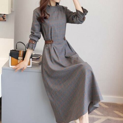 ワンピース ミモレ丈 長袖 ラウンドネック グレンチェック きれいめ 上品 オフィス 通勤 お呼ばれ デート パーティ グレー 秋冬