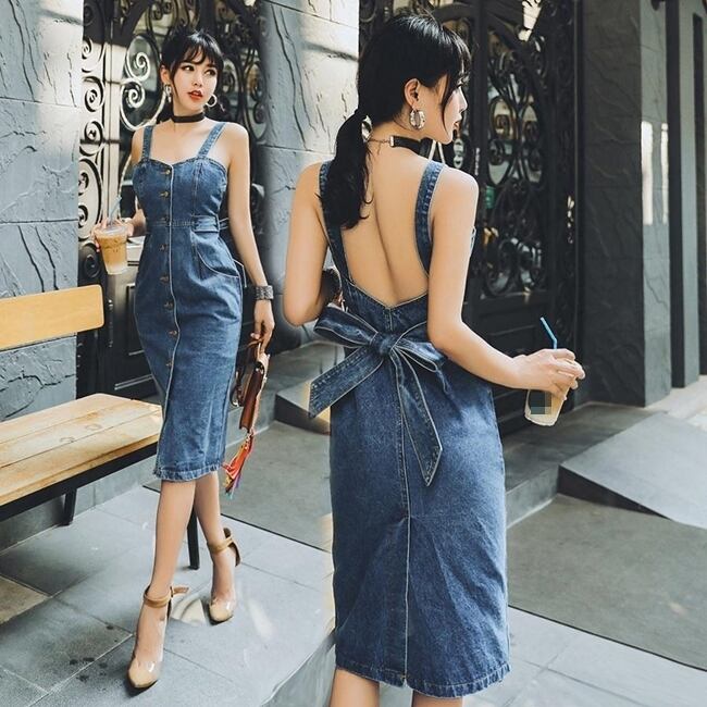 ワンピース サロペットスカート ジャンパースカート デニム バックコンシャス バックシャン 背中見せ ウエストリボン スリム タイト フロントボタン ミディ丈 カジュアル きれいめ 大人可愛い デート 春 夏