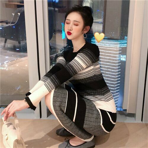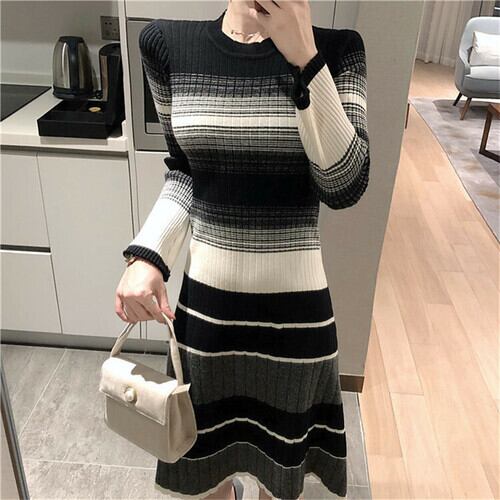 全2色 ニットワンピース ニットドレス ボーダー スリム フィット 大人セクシー フェミニン 長袖 ラウンドネック ひざ丈 ミモレ丈 レトロ カジュアル 韓国 オルチャン