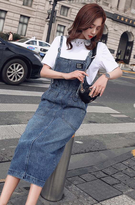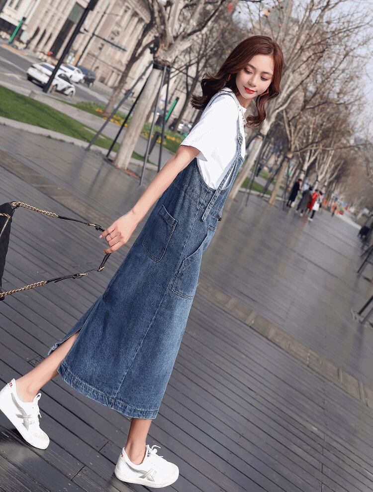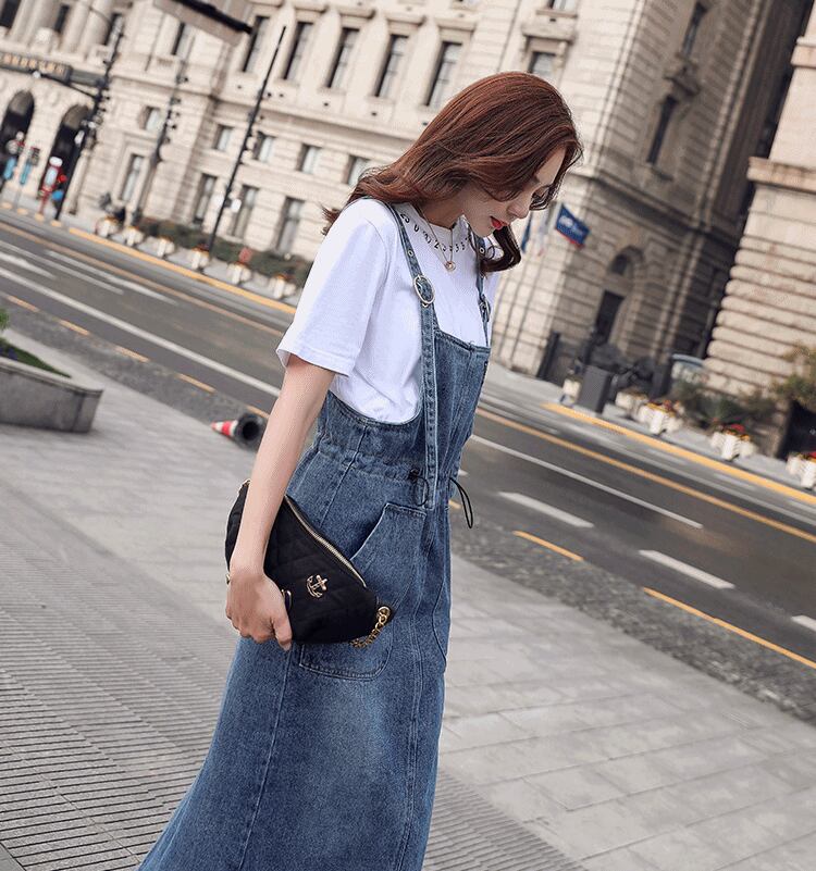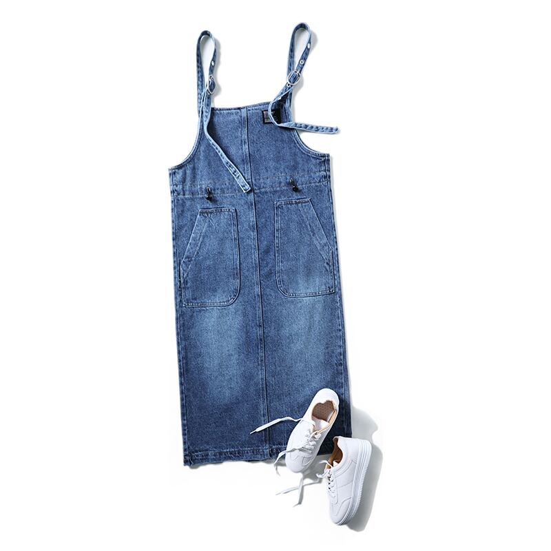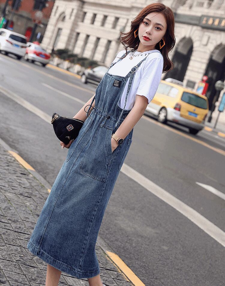 サロペットスカート ジャンパースカート サスペンダー デニムワンピース ウエストシャーリング ミモレ丈 カジュアル 大人 お出かけ デート スリム ジーンズ 春 夏