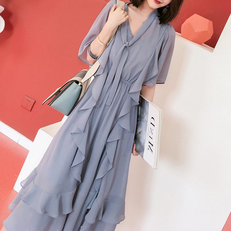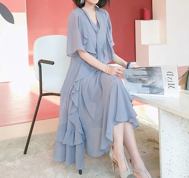 全2色 ワンピース サマードレス ミモレ丈 フリル フレア Vネック シフォン 5分袖 フレアスリーブ 無地 大人 カジュアル きれいめ デート 女子会 ゆったり お出かけ 春 夏
