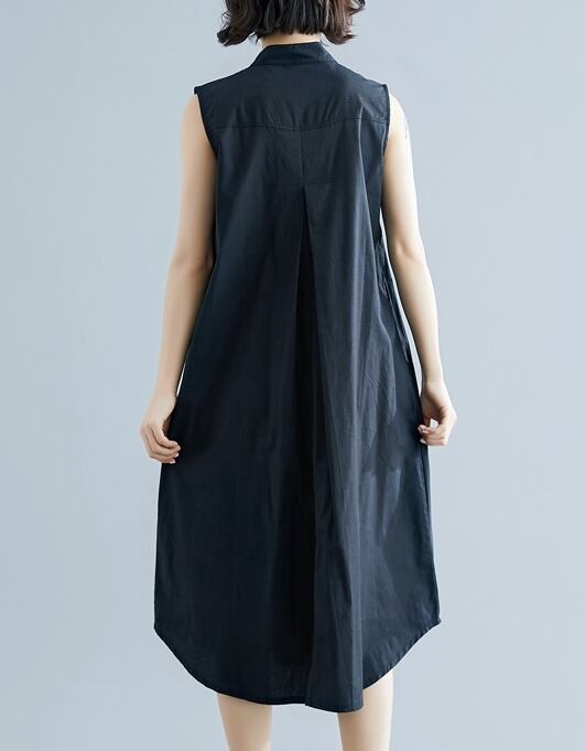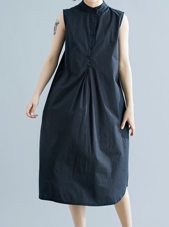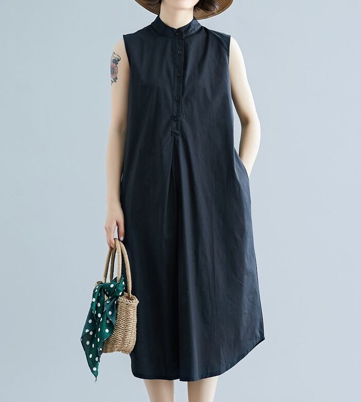 全2色 ワンピース ミモレ丈 ネックボタン スタンドカラー ゆったり シンプル タック入り カジュアル ノースリーブ 大人 デイリー 無地 お出かけ 春 夏