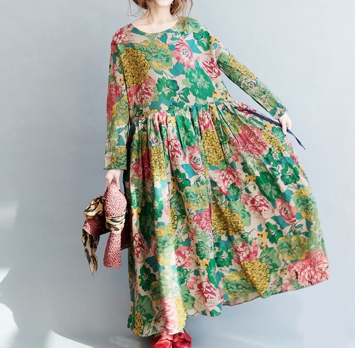 花柄 ワンピース ラウンドネック ロング丈 ゆったり ビッグシルエット フレア 長袖 マキシ丈 カジュアル リゾート 華やか 大人 フェミニン お出かけ 春 夏