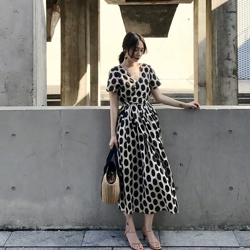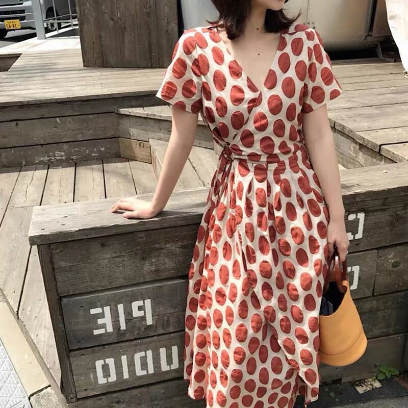全2色 ワンピース カシュクールワンピ Vネック 半袖 ドット柄 水玉 ウエストシャーリング フレア ゆったり ロング丈 大人可愛い カジュアル お出かけ リゾート レトロ 春 夏