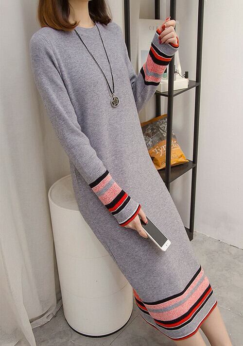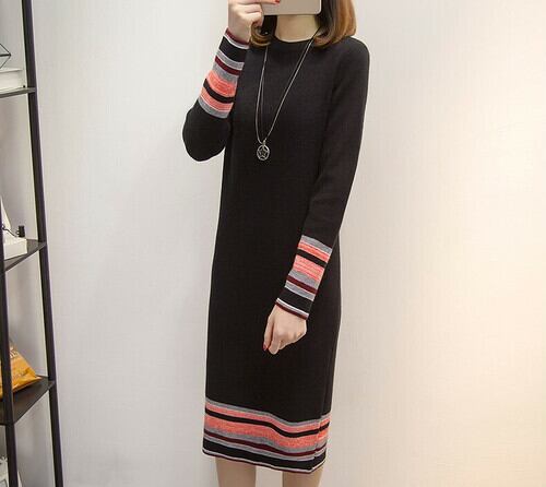 全2色 カラーライン マルチカラー ボーダー ニットワンピース ドレス ひざ丈 ミモレ丈 長袖 スリム タイト ラウンドネック 上品 大人カジュアル 秋 冬 シンプル ベーシック 韓国 オルチャン