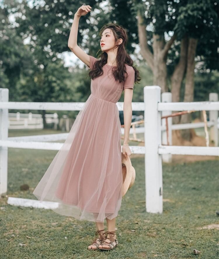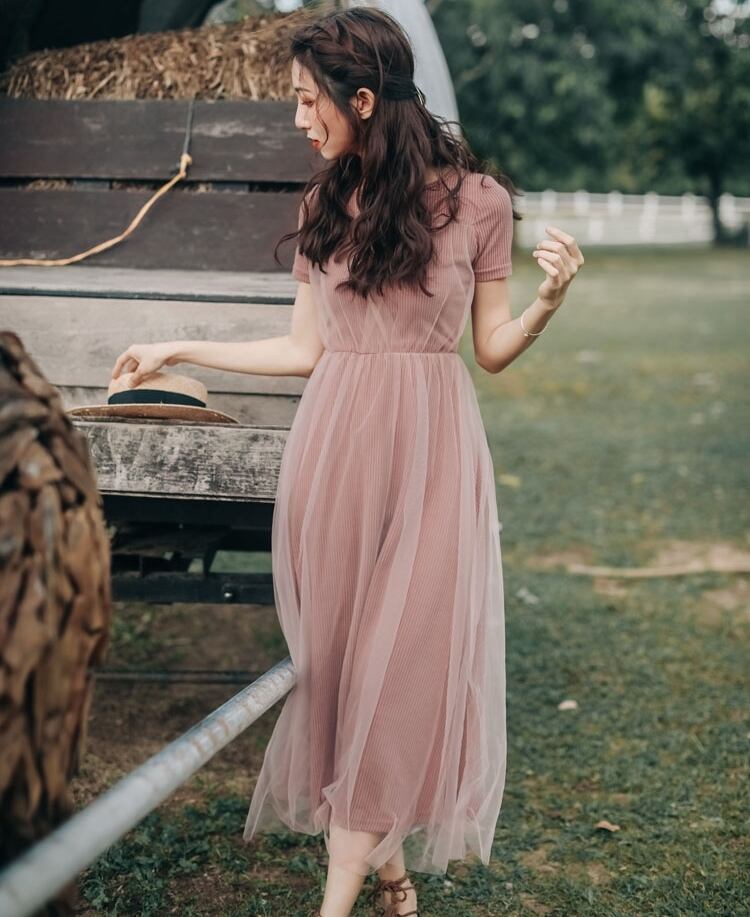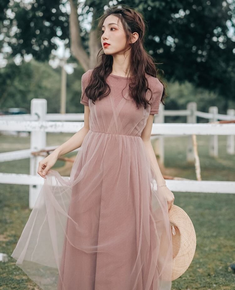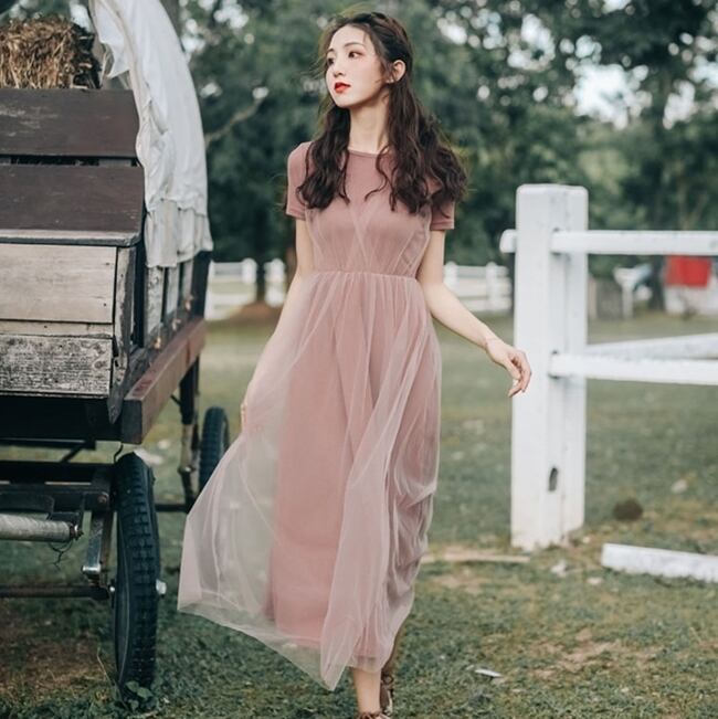 ワンピース チュール フレア クルーネック 半袖 上品 可愛い ロング丈 カジュアル きれいめ リゾート スリム デート フェミニン 春 夏