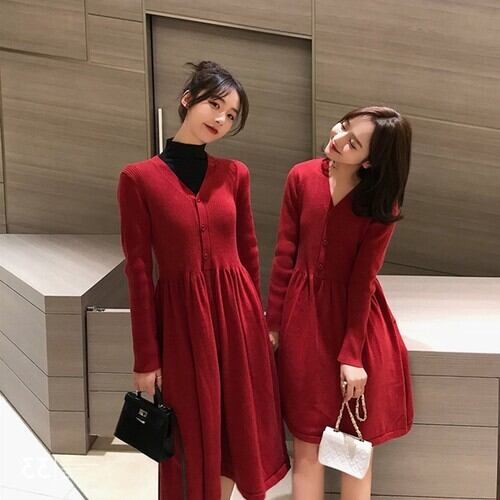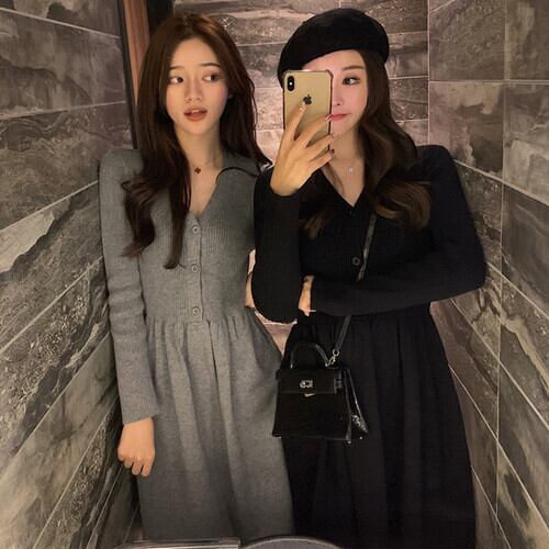 全2種4色 選べる丈 ニットワンピース ひざ丈 ミニ丈 フロントボタン フレアスカート 秋 冬 シンプル ニットドレス Vネック 長袖 エレガント カジュアル 韓国 オルチャン