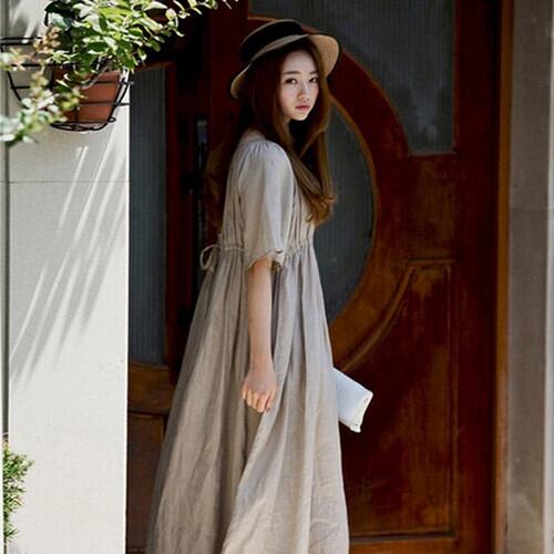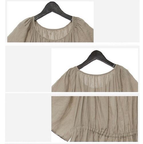 ワンピース リゾートワンピース ロング丈 マキシ丈 リネン 半袖 ラウンドネック ゆったり 体型カバー きれいめ リゾート フェミニン レトロ ナチュラル 夏 カーキ
