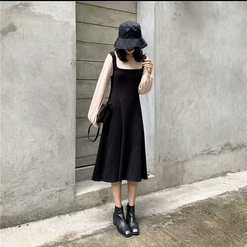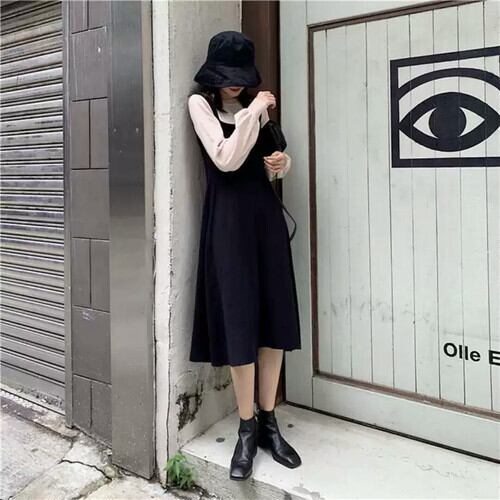 フェイクツーピース ニット ワンピース ロング丈 ふんわり 裾広がり 大人 カジュアル キレイめ シンプル フリーサイズ お出かけ お買い物 デート 女子会 秋冬 通学 通勤 学生 春