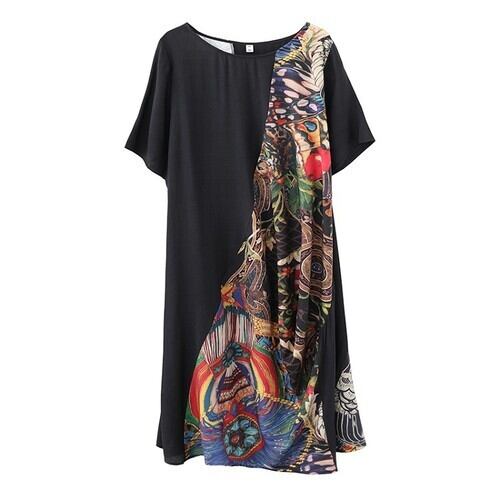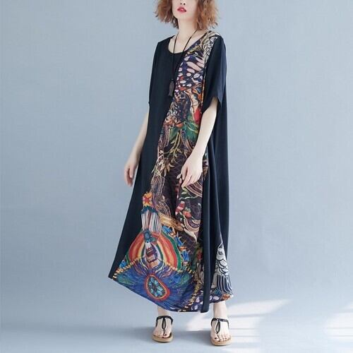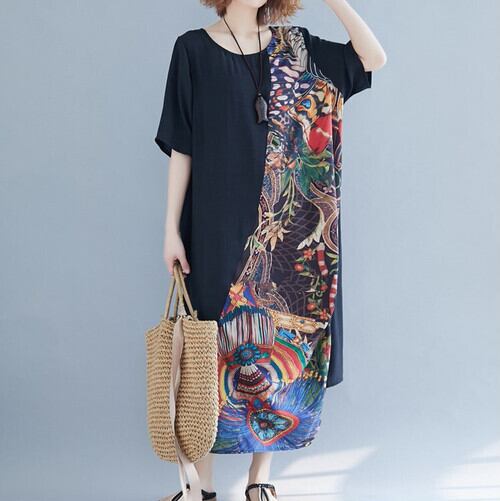 ワンピース ロングTシャツ ロング丈 マキシ丈 和柄 半袖 ラウンドネック 大きいサイズ ゆったり きれいめ リゾート フェミニン レトロ カジュアル 夏 ブラック